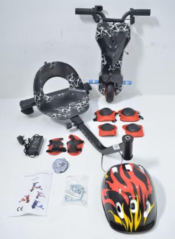This drift scooter is perfect for smooth surfaces like parks, driveways, and open areas. It features sturdy tires, easy-to-use controls, and safety as a top priority. Included in the package are a helmet and full protective gear for elbows, knees, and wrists — making this the safest choice for your kids.